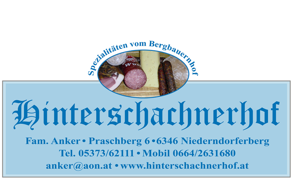 | Veranstalter: | HINTERSCHACHNERHOF Familie Anker-Feistl Spezialitäten vom Bergbauernhof wie SPECK, WURSTWAREN, KÄSE Niederndorferberg TIROL |